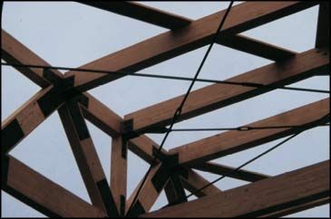 My son John shot this unique truss in a church under construction in a Washing-ton, D.C., suburb. I don’t know if it’s a commercially available design or an architect’s creation. Regardless, the thin rods serve as tension members, and they would heat rapidly during a fire and deliver heat to their connections with the heavy wood compression members (just as some cooks use nails to heat the interior of baking potatoes). Thus, a fire could attack a connection on the exterior and the interior.
