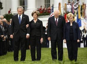 ![]() AP Photo/Pablo Martinez Monsivais President Bush and first lady Laura Bush, left, accompanied by Vice President Dick Cheney and his Lynne, and White House staff, observe a moment of silence on the South Lawn of the White House in Washington, Thursday. |