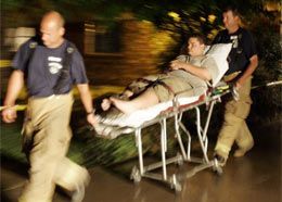 A Boy Scout is wheeled out of the West Harrison High School in Mondamin, Iowa, early Thursday morning.