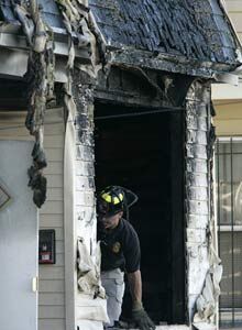 ![]() AP Photo/Mike Derer A fire fighter looks at damage inside a burned out house where three people died in Irvington, N.J., on Monday. Three bodies were found — it appears the fire was set to conceal a homicide. |