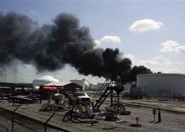 ![]() AP Photo/Ed Zurga Dark smoke billows into the sky from a fire at a gasoline storage tank Wednesday, in Kansas City, Kan. A tank containing 1.2 million gallons of unleaded gasoline erupted after being hit by lightning. |