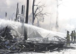 ![]() AP Photo/Lisa Poole Firefighters hose down the four-story apartment building that was gutted by fire. |