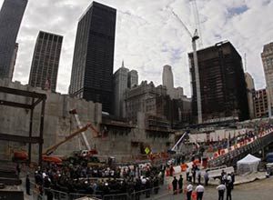 Relatives of victims began arriving at dawn at ground zero, now a huge construction site. American flags were draped over silent cranes.
