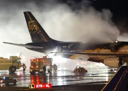 Firefighters battle a fire onboard a United Parcel Service airplane Wednesday at Philadelphia International Airport. Investigators were seeking the cause of the blaze, which broke out while the plane was on the ground with no crew members onboard. (AP Photo/Joseph Kaczmarek)