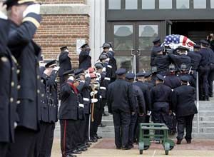 Hundreds of firefighters from throughout the region volunteered to staff the city’s 30 fire stations and 15 ambulance crews so the city’s 700 firefighters could attend Thursday’s services. The volunteers brought firetrucks and equipment so the city’s pumpers and more than 30 aerial ladder trucks could line the procession route to St. Peter’s Cemetery.