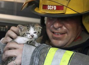 “We found this one inside,” Capt. John Leahey said, while carrying the kitten out of an emergency vehicle. “Hopefully its injuries are only about as bad as a bad sunburn.”