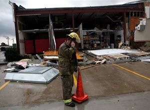 ![]() AP Photo/Daily Oklahoman, John Clanton A firefighter talks on a cell phone in front of a restaurant damaged by a storm in Oklahoma City, Tuesday afternoon. |