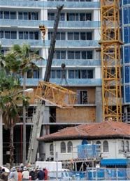 ![]() AP Photo/Wilfredo Lee Construction workers look on as a section of the fallen crane is lifted from a house that contractors were using as an office. |