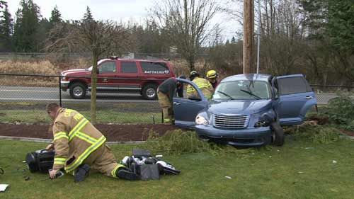 ![]() Photo David Furtado The crew of engine 66 responds to an auto accident. When the firefighters arrived, they saw a single car had crashed through a chain-link fence. |