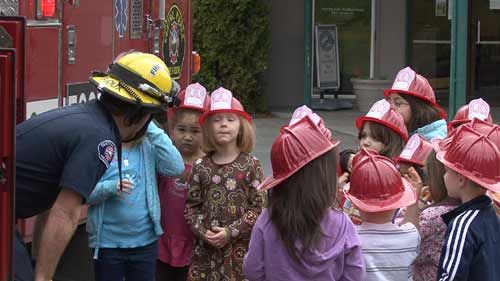 ![]() Photo David Furtado After responding to a call, a lieutenant visits a school to teach students about fire safety, with the help of helmets for the children. A class from the school had visited the station for a tour and were able to watch firefighters leave when Engine 66 got a call. |