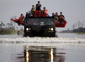 ![]() AP Photo/Eric Gay Search and rescue workers drive down a flooded road in the Sabine Pass area of Port Arthur, Texas, Sunday, after Hurricane Ike. |