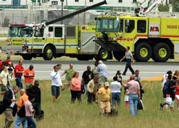 ![]() AP Photo/Luis M. Alvarez Passengers walk in a field after exiting a U.S. Airways plane on the runway after landing at Miami International Airport Aug. 31, 2006. A jetliner’s landing gear caught fire when two of its tires blew out on the runway, officials said. No one was injured, and the fire was quickly extinguished. |