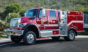 The KME Combination Rescue has seating for two and includes a custom bumper with a foam system. Features include a water/foam tank, pump, and two armless awnings.