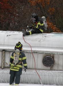 ![]() Photo Phil Sullivan/Wellinvolved.com Firefighters work on the tanker carrying jet fuel that overturned on I-95 Thursday. |