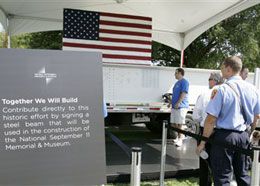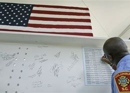 ![]() Firefighter D.J. Brooks signs the steel beam that will be used in the construction of the national memorial to be built in New York City during the kick off for the National September 11th Memorial and Museum tour, Monday, in Columbia, S.C. (AP Photo/Mary Ann Chastain) |