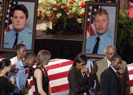 ![]() AP Photo/John Bazemore Family members of the nine Charleston firefighters killed in June react as they walk past the row of caskets and portraits. |