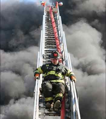 Both departments positioned apparatus in a safe manner and set up a collapse zone early into the incident, thus preventing possible harm to personnel and apparatus. At the height of the blaze, two ladder pipes, one tower ladder and numerous handlines fought to contain the fire to the building of origin. (The photograph shows Cicero Firefighter Michael Slabanak coming down the aerial ladder after making an adjustment to the ladder pipe.)