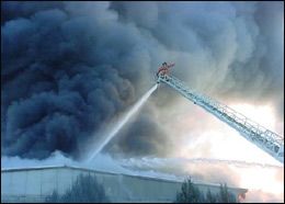 ![]() PHOTO COURTESY OF SYLVIA’S DESIGN PHOTOGRAPHY Middleton firefighter/EMT John Filler works on the ladder of Truck 331 to knock down flames in Middleton High School’s gym. |