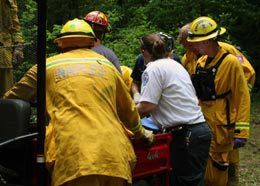 The team deployed a belay line and a 3:1 haul line to lower two rescuers and stokes basket into the ravine after the hiker dropped a reported 75 feet into a stream below.