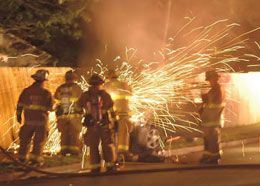 Resting in a nearby police car and calming down after the accident, the driver watched as firefighters stretched a booster line from the front of Engine 3-1-3 to put the fire out.