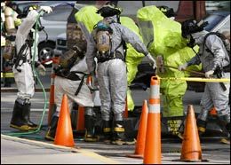 ![]() PHOTO BY CRAIG ROSE Members of the San Jose Fire Department spray down fellow firefighters during a haz mat incident. |