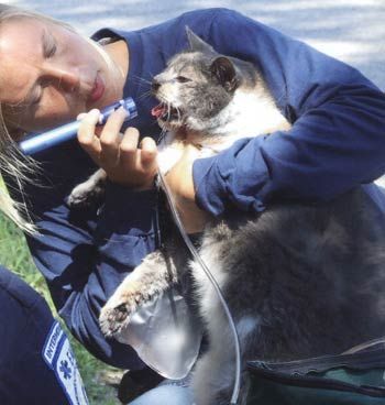 On July 30, Holliston (Mass.) firefighters responded to a one-alarm fire in a ranch-style home. While searching the home, firefighter Greg Lewis found a mixed-breed cat in a room next to the garage. Fire personnel administered oxygen to the cat, which was later taken by the MSPCA to Tufts. The fire apparently started in the kitchen. No one was injured.