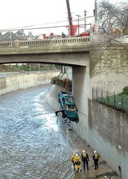 Fortunately, even though the area was inundated with heavy rains at the time, the water traveling down the flood control channel was less than 6 inches deep. Both occupants of the car were able to self extricate themselves and were found standing in the water.