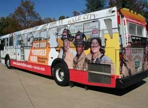 ![]() Photo Dale City VFD A Va. transit bus covered with pictures of firefighters becomes a mobile billboard for volunteer recruitment. |
