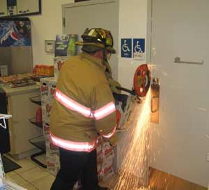 I pounded on the door and checked the lock. Lazz checked the lock a second time, and Bishop evaluated the lock and metal door jamb. We all agreed that the circular saw was the best course of action to make entry. Bishop headed out to get the saw and warned the clerk, “It’s going to get loud in here.”