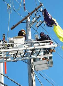 ![]() AP Photo/Greg Worden Skydiver Cameron King, right, who became tangled in power lines, climbs onto a fire department ladder as a power company lineman looks on, Saturday. |