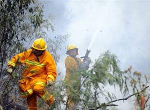 AP Photo Country Fire Authority firefighters put out flames on a tree near the township of King Lake, east of Melbourne, Sunday. |