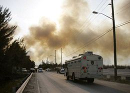 ![]() AP Photo/J. Pat Carter A prison bus approaches a road block leading to the Metro West Detention Center in Miami, Monday, as a wildfire nears the prison and heavy smoke hangs overhead. 2,634 inmates are being evacuated. |