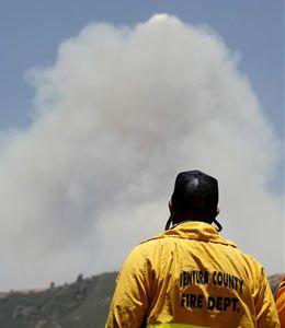 ![]() AP PHOTO MICHAEL A. MARIANT Firefighter Joe Pasinato watches as a column of smoke rises from a flare-up at the Zaca Fire burning near Santa Ynez, Calif. More than 2,000 firefighters were battling the Zaca Fire in steep terrain in the San Rafael Wilderness. |