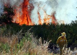 ![]() AP Photo/Joe Kaleita A firefighter walks away from burning brush in the Oakmont Preserve subdivision in Malabar, Fla., Tuesday. |