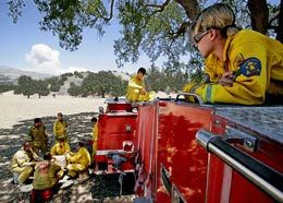 |AP Photo/Michael A. Mariant Firefighters rest after tackling the Zaca Fire north of Santa Barbara last month. |