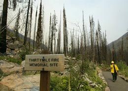 ![]() AP Photo/Ted S. Warren A memorial marking the site where four firefighters died while fighting the Thirtymile Fire on July 10, 2001, is seen in 2003. Thirtymile crew boss Ellreese N. Daniels was charged with involuntary manslaughter and lying to investigators in Dec. 2006. |